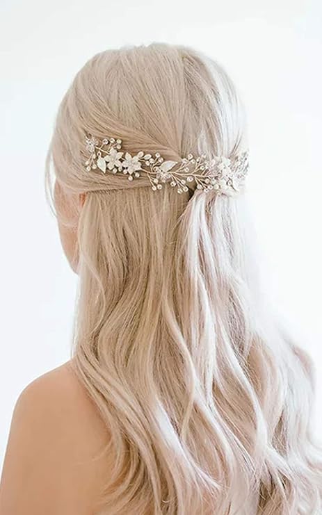 Les accessoires cheveux mariage perles et les fleurs s'associent idéalement à des cheveux lâchés ondulés un peu flous.